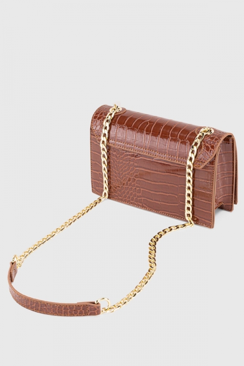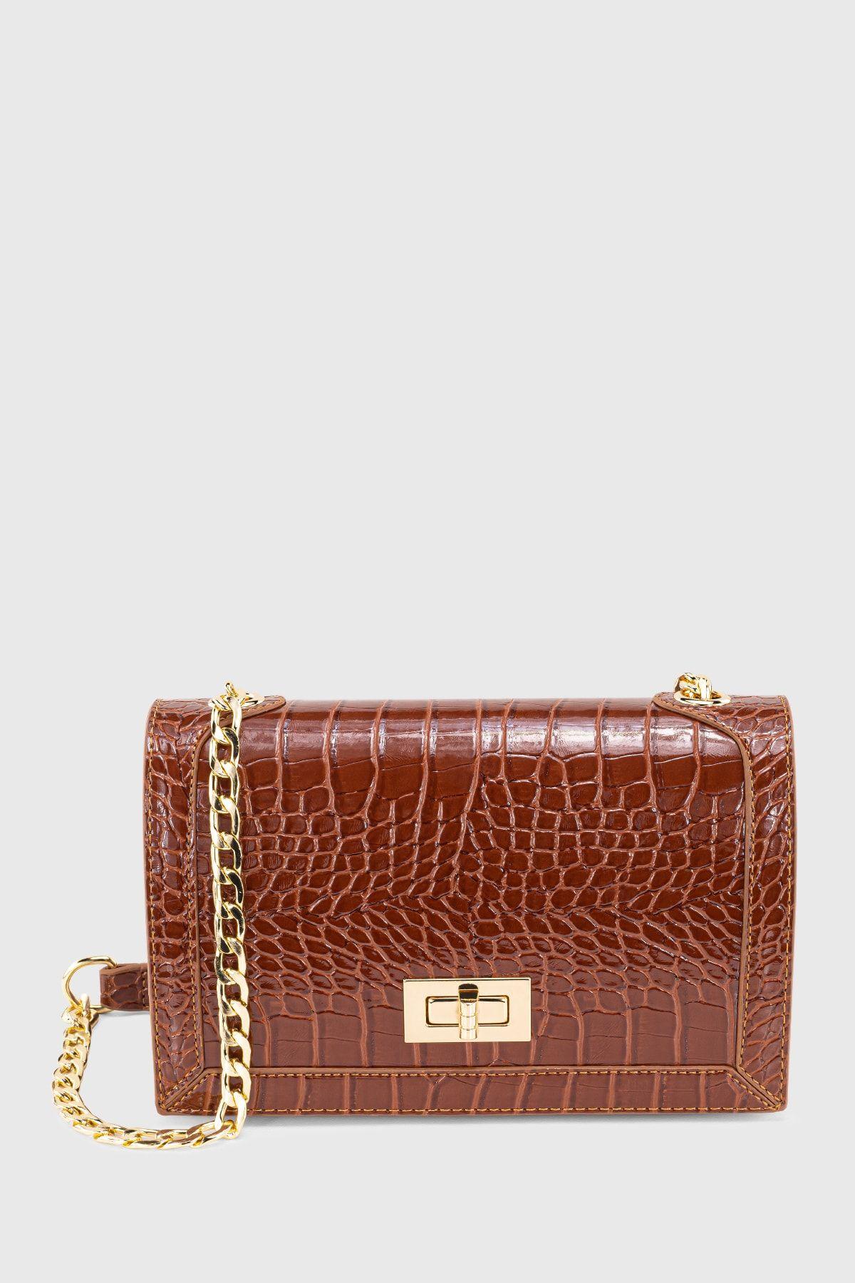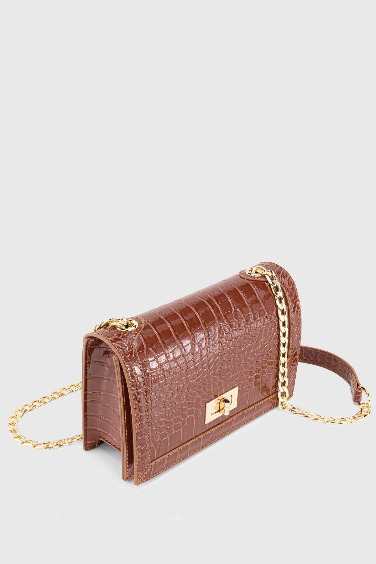 Kadın Kahverengi Zincirli Tokalı Timsah Derisi Görünümlü Çapraz Çanta 221