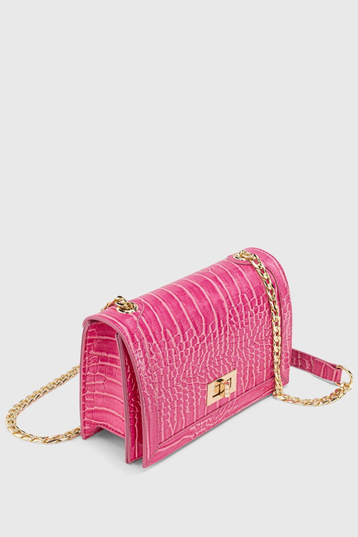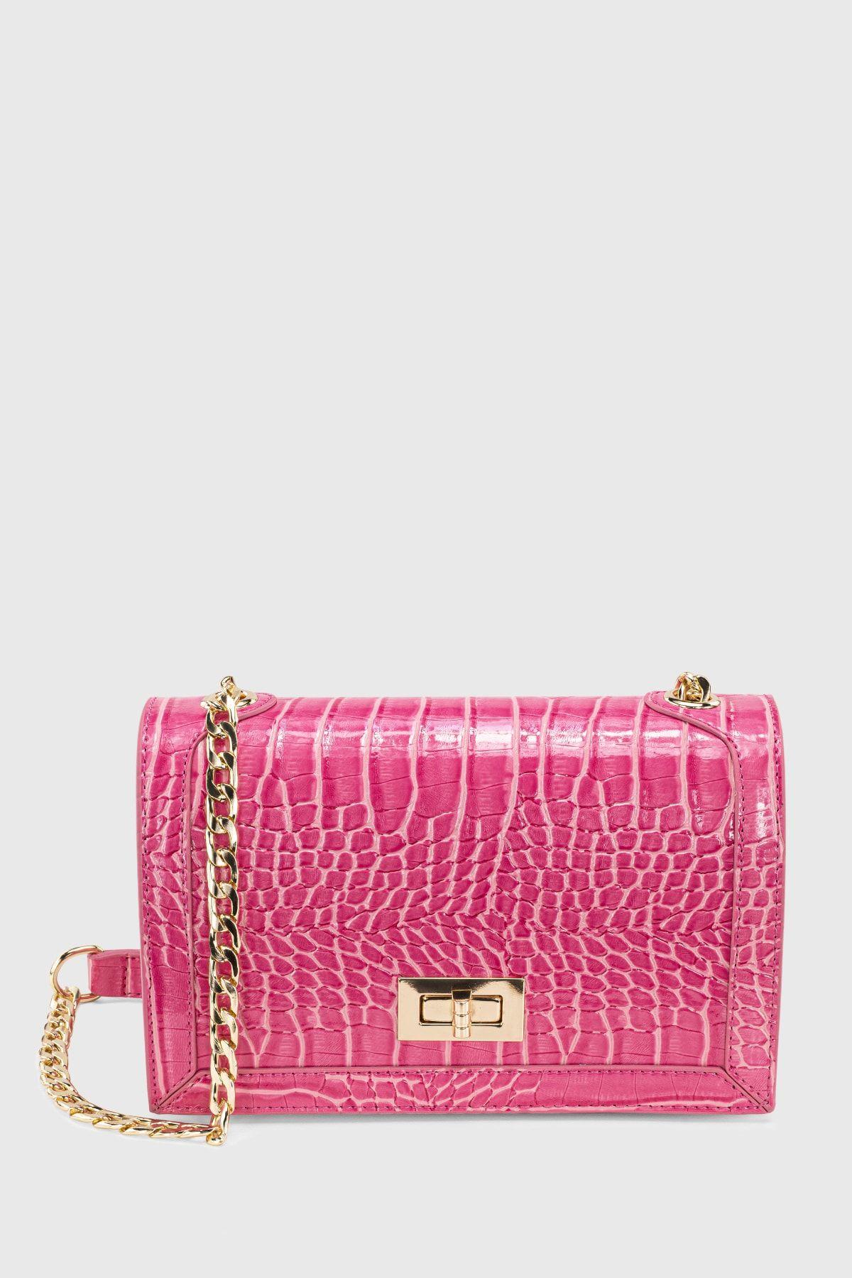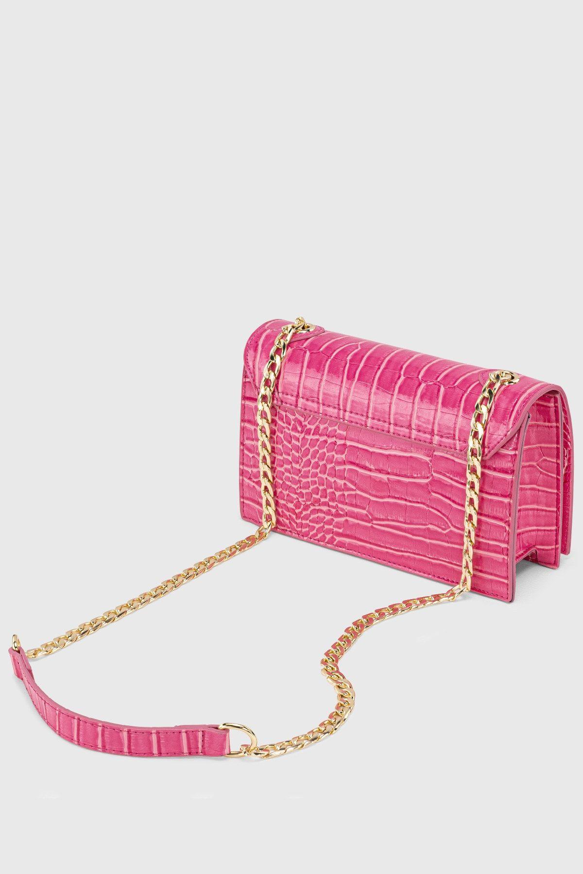 Kadın Pembe Zincirli Kilitli Timsah Desenli Çapraz Askılı Çanta 224